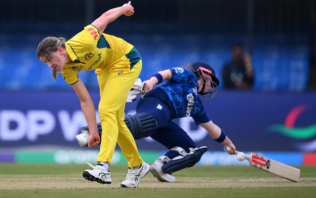 വുമൺസ് വേൾഡ് കപ്പിൽ ആസ്ട്രേലിയയുടെ പേസർ സദർലൻഡിന്റെ കൂപ്പിൽ ഇംഗ്ലണ്ടിന്റെ ബാറ്റ്സ്മാൻ ജോൺസ് പുറത്തായി, ടീമിന്റെ മികച്ച ആരംഭം തകർന്നു. ജോൺസ് തുടക്കത്തിൽ നല്ല ഫോമിൽ നിന്നിരുന്നുവെങ്കിലും, സദർലൻഡിന്റെ കൃത്യമായ ബോളിങ്ങ് അത് തകർത്തു. ഈ വിക്കറ്റ് സംഘത്തിൽ നിന്നുള്ള പങ്കാളിത്തം അവസാനിപ്പിക്കുകയും ഇംഗ്ലണ്ടിന് സമ്മർദ്ദം സൃഷ്ടിക്കുകയും ചെയ്തു. കളിയുടെ ഗതിവികാസത്തിൽ ഈ വിക്കറ്റ് വലിയ മാറ്റമുണ്ടാക്കി, ആസ്ട്രേലിയക്ക് നിയന്ത്രണം നേടാനുള്ള അവസരം നൽകി. മത്സരത്തിന് ഇപ്പോഴും ഉറ്റുനോക്കാവുന്ന ഒരു ത്രില്ലർ ആയി തുടരുകയാണ്. ലോകമെമ്പാടും ആരാധകർ ഇംഗ്ലണ്ടിന് ഈ തിരിച്ചടിയിൽ നിന്നും എങ്ങനെ മടങ്ങിവരാനാണെന്ന്, സദർലൻഡ് തന്റെ മുന്നേറ്റം എങ്ങനെ തുടരുന്നുവെന്നു ശ്രദ്ധയോടെ നോക്കുകയാണ്.