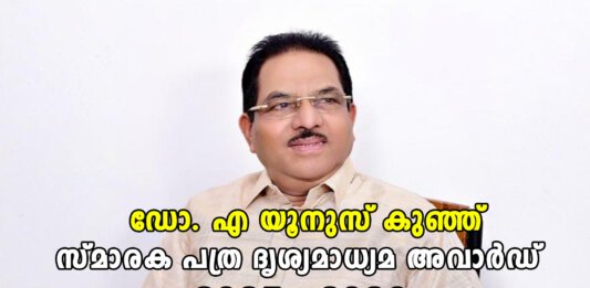 പ്രമുഖ വ്യവസായിയും നിരവധി വിദ്യാഭ്യാസ സ്ഥാപനങ്ങളുടെ സ്ഥാപകനും മുൻ എം.എൽ.എ യുമായിരുന്ന ഡോ. എ. യൂനുസ് കുഞ്ഞിന്റെ സ്മരണാർഥം കൊല്ലം പ്രസ് ക്ലബ്ബും ഫാത്തിമ മെമ്മോറിയൽ എഡ്യൂക്കേഷണൽ ട്രസ്റ്റും സംയുക്തമായി ഏർപ്പെടുത്തിയ മൂന്നാമത് പത്ര–ദൃശ്യമാധ്യമ അവാർഡുകൾ പ്രഖ്യാപിച്ചു. mcRelated Posts:രണ്ടാമത് ഡോ. എ. യൂനുസ് കുഞ്ഞ് സ്മാരക പത്ര -ദൃശ്യ…കൊല്ലം ജില്ലയിൽ 10.10.20ലെ കോവിഡ് 1107; സമ്പർക്കം 1083കൊല്ലം ജില്ലയിൽ ഇന്ന് (2.10.20) കോവിഡ് 892; സമ്പർക്കം 881കൊല്ലം ജില്ലയിൽ 13.10.20ലെ കോവിഡ് 907; സമ്പർക്കം 862കൊല്ലം … Continue reading മൂന്നാമത് ഡോ. എ യൂനുസ് കുഞ്ഞ് സ്മാരക പത്ര -ദൃശ്യമാധ്യമ അവാർഡ് ആർ സുനിലിനും മാർഷൽ വി സെബാസ്റ്റ്യനും; ഫെബ്രുവരി 3 ന് കൊല്ലം പ്രസ് ക്ലബ്ബിൽ അവാർഡ് വിതരണം